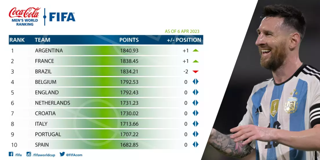 El elenco albiceleste encabezó por última vez el ranking de la FIFA el 9 de marzo de 2017, instancia en la que cedió su trono a Brasil. Justamente es la Verdeamarela la selección que perdió su lugar de privilegio en esta edición de abril de 2023. Después de caer en el amistoso de la ventana FIFA ante Marruecos, los triunfos de Argentina ante Panamá y Curaçao le permitieron escalar hasta el número uno. Brasil, en cambio, cayó hasta el tercer lugar.