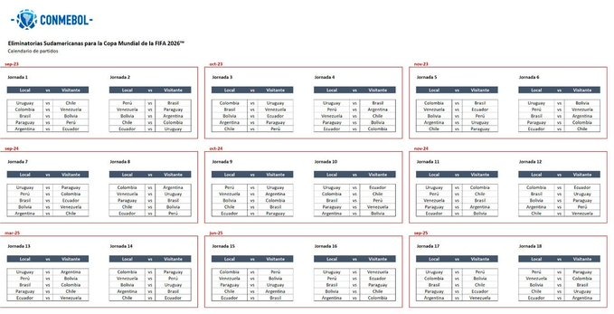 La Conmebol dio a conocer el calendario de las eliminatoria para definir los clasificados a la próxima Copa del Mundo, que se disputará en Estados Unidos, México y Canadá.