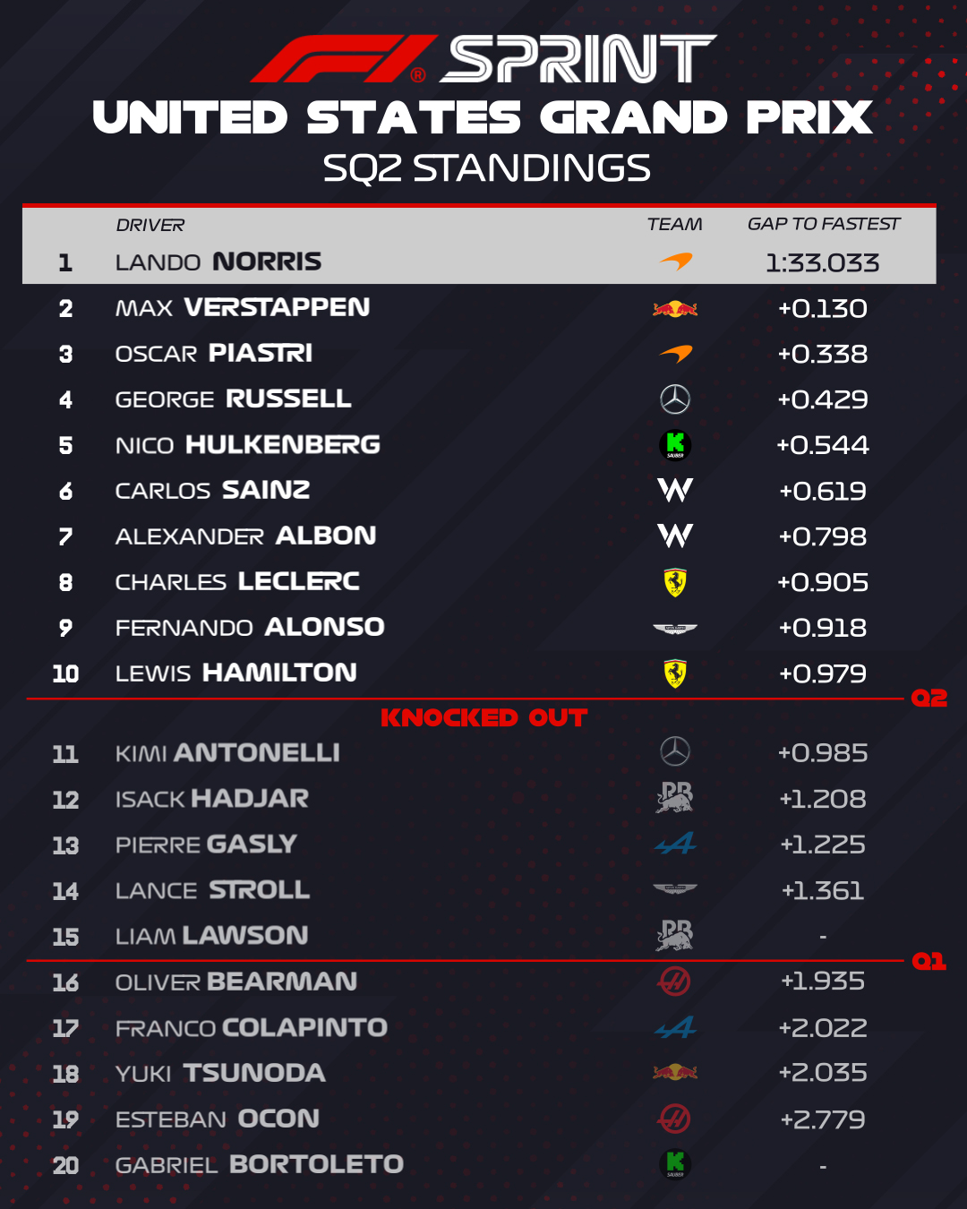 En la tanda inicial quedaron eliminados Gabriel Bortoleto (Sauber, 20°), Esteban Ocon (Alpine, 19°), Yuki Tsunoda (Red Bull Racing, 18°) y Oliver Bearman (Haas, 16°), mientras que Oscar Piastri (McLaren) marcó el mejor tiempo.