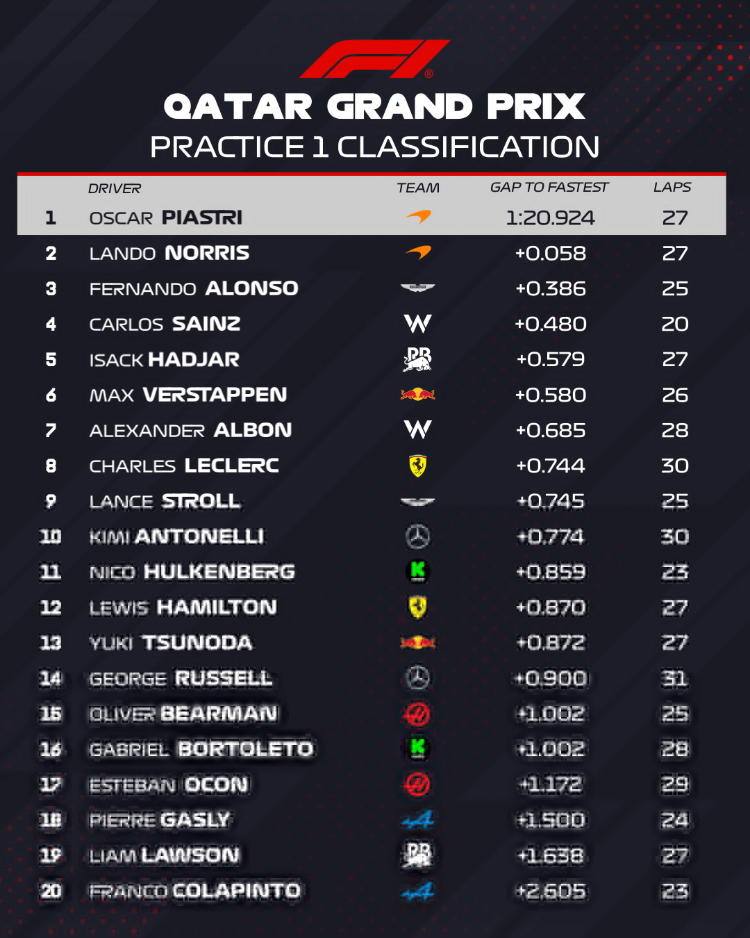En el segundo puesto se ubicó el británico Lando Norris, líder del campeonato, a tan solo 58 milésimas de su compañero de equipo. En tanto, el otro aspirante al título, el neerlandés Max Verstappen (Red Bull), tuvo una tanda complicada, se mostró incómodo con el monoplaza y finalizó sexto, a algo más de medio segundo del tiempo de referencia.
