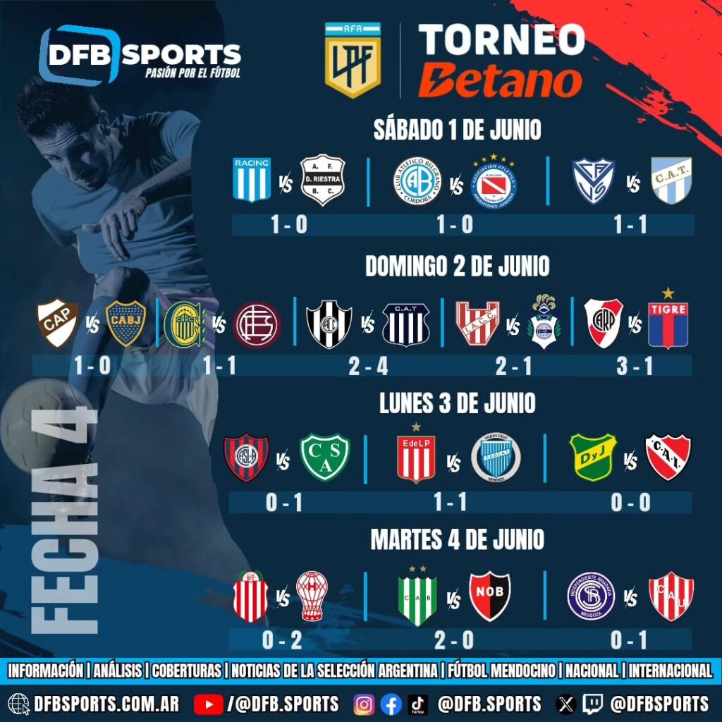 Concluyó la cuarta fecha del Torneo Betano 2024 y la tabla de posiciones tiene cuatro líderes invictos con 10 puntos: Racing, Talleres de Córdoba, Huracán y Unión de Santa Fe. Todos ganaron sus respectivos partidos, manteniendo su racha sin derrotas. River se mantiene cerca, mientras que Boca, San Lorenzo e Independiente no logran despegar.