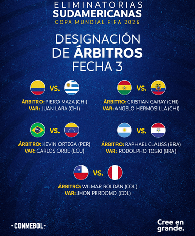 - Fecha 3: Colombia vs. Uruguay (Árbitro: Piero Maza, Chile)