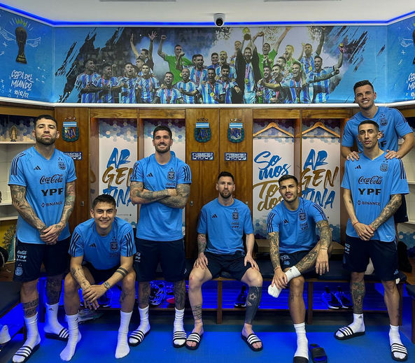 En la previa de la práctica, Messi, De Paul, Lo Celso (quien se perdió el Mundial por lesión), Di María, Paredes y Dybala (en lugar de «Papu» Gómez) se tomaron una foto que apareció en redes sociales. Se trata de una actualización de la fotografía que publicaron en un sector del vestuario del predio de AFA, mucho antes de la realización de la Copa del Mundo.